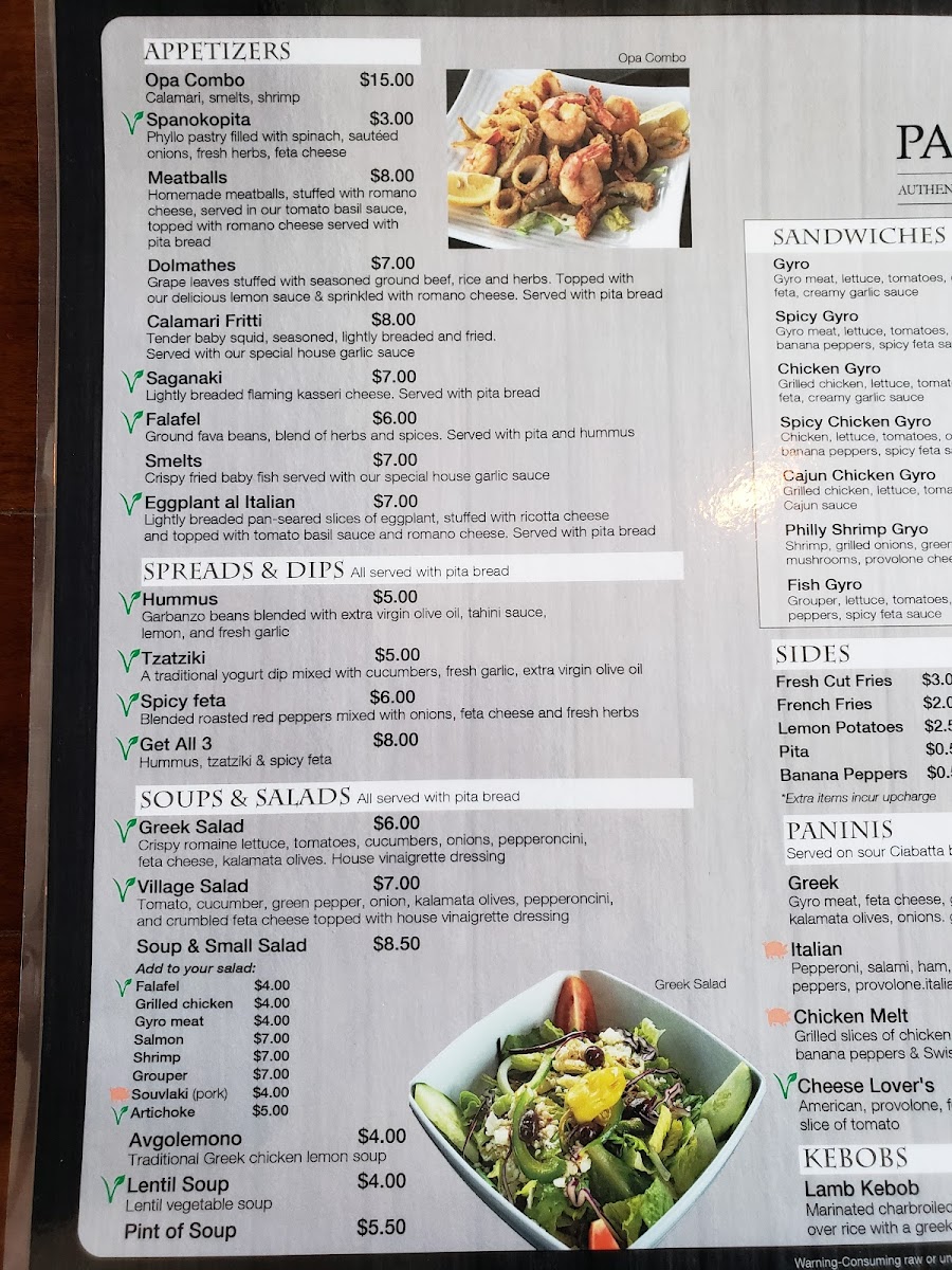 The menu at Panini Opa features a diverse selection of Greek and Italian dishes, structured into several key categories to accommodate various dining preferences. The offerings include fresh salads, sandwiches and gyros, kebobs, pasta dishes, and a range of desserts. This layout allows diners to easily explore options from light starters and salads to more substantial entrees.